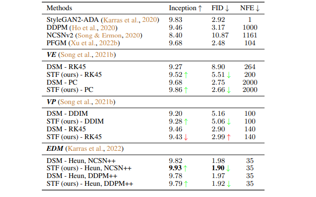 - When incorporated into EDM, the STF objective achieves state-of-the-art performance on CIFAR10 unconditional generation and improves the FID/Inception scores for other variants of score-based models.